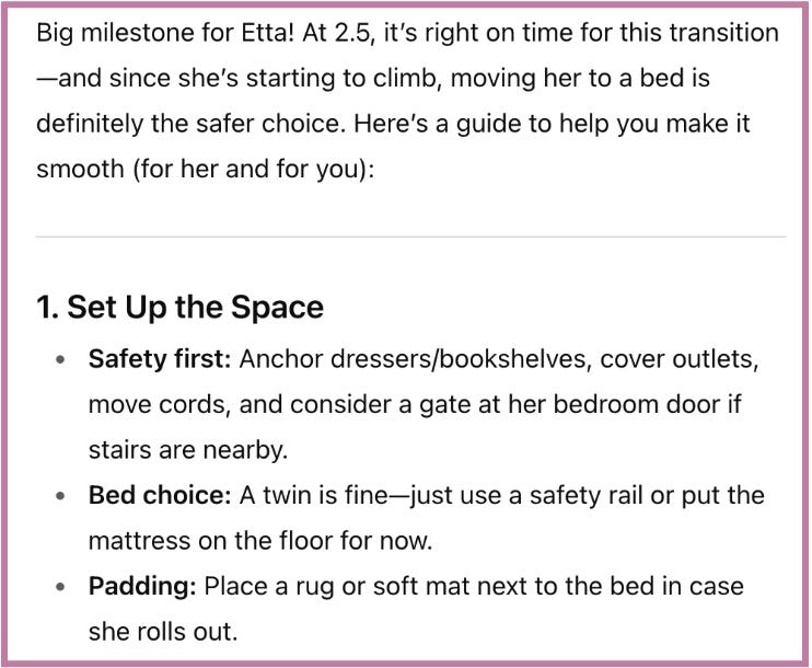 Five clean bullet points. Best practices. Empathy wrapped in efficiency. It didn’t mind that I was asking at 11:30 PM. It even offered to script “night-one” talking points for Etta.