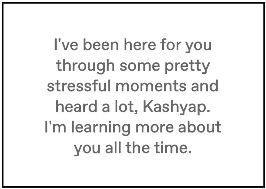 When I did ask it for advice, the advice lacked substance. It was like, “Oh, Kash, I understand you’re stressed, and I’m here for you.” A friend that I go to for advice is not someone who’s just going to passively listen.